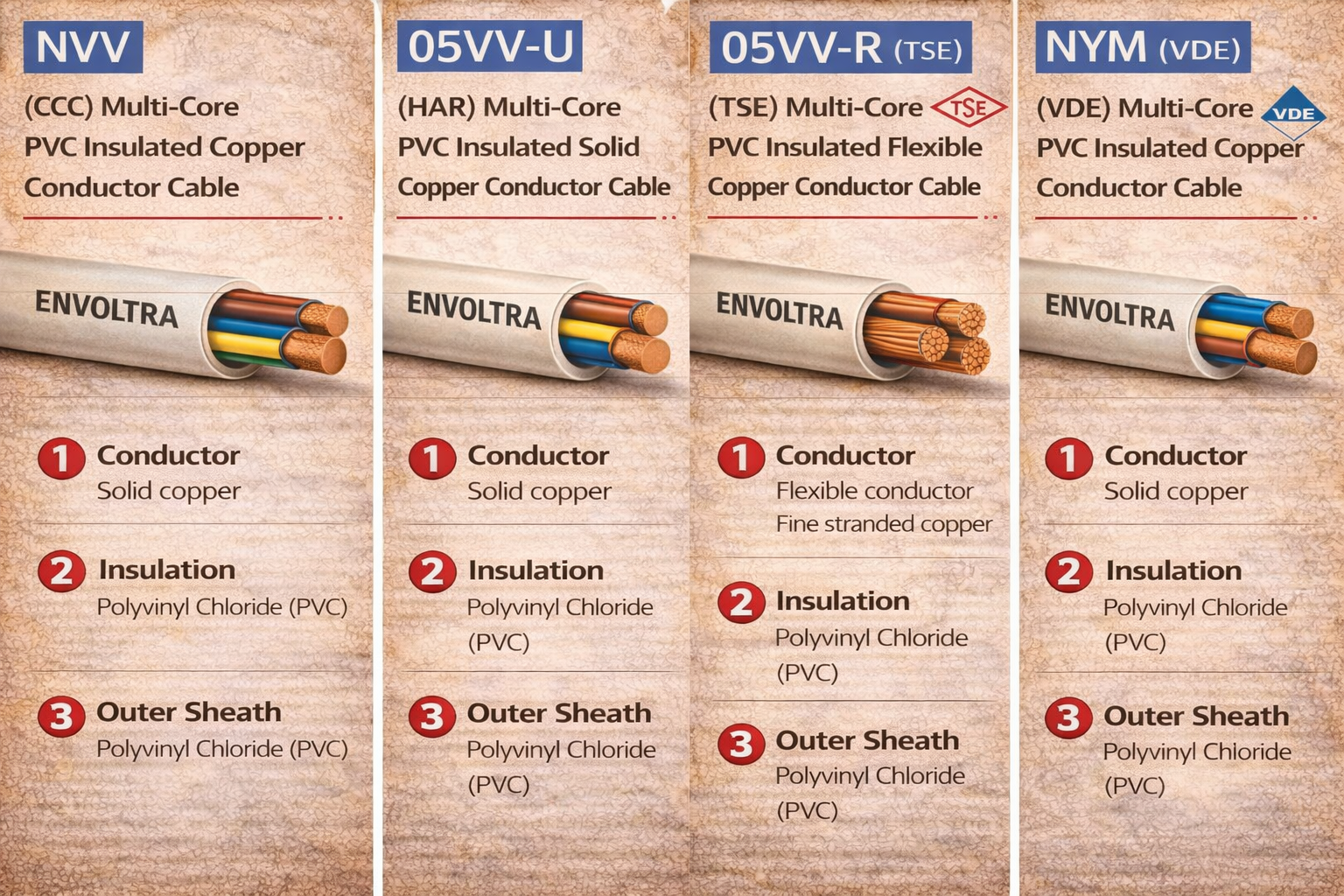 NVV, 05VV-U , 05VV-R (TSE), NYM(VDE), Cu/PVC/PVC